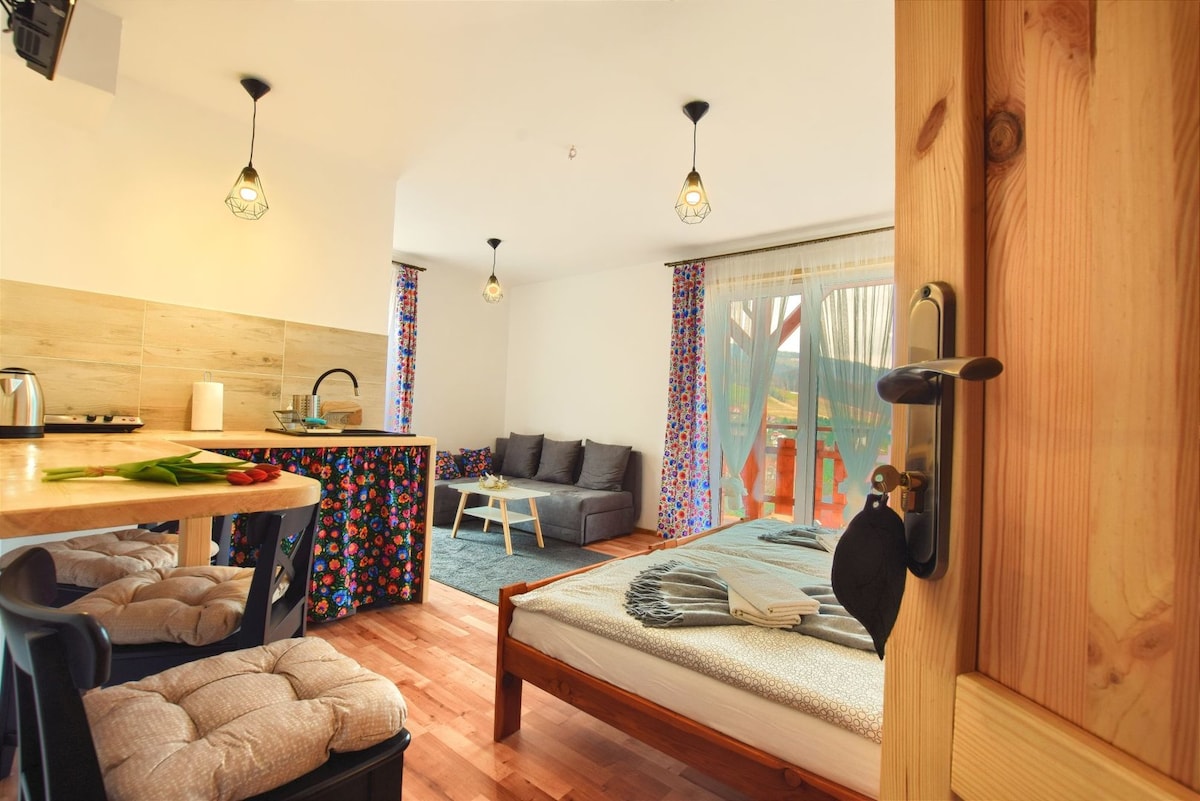 Settlement 3 Harnasi 1 è un appartamento che costituisce la metà di una casa tipo fienile con ingresso diretto dal cortile. Il prezzo include l'accesso alla vasca idromassaggio e alla sauna. È un luogo dove troverete pace e tranquillità. La nostra più grande attrazione è la natura: suoni della foresta, panorami e odori, e la semplicità della vita, le passeggiate, il caffè mattutino sul terrazzo e un fuoco serale. Ci sono molti sentieri escursionistici nelle vicinanze, escursioni a piedi o in bici. Il posto è anche una buona base per sciare.