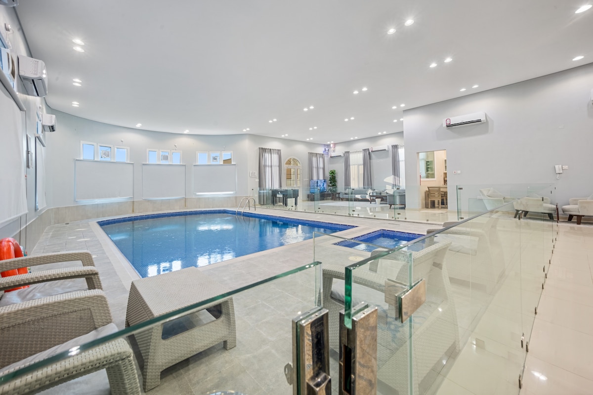 20 minutes from Doha, this villa contains a swimming pool, paddle court, playground,majlis 4 bedrooms + a maids room. 1000 insurance is paid in cash and returned at check out